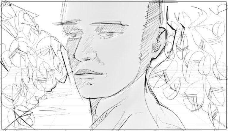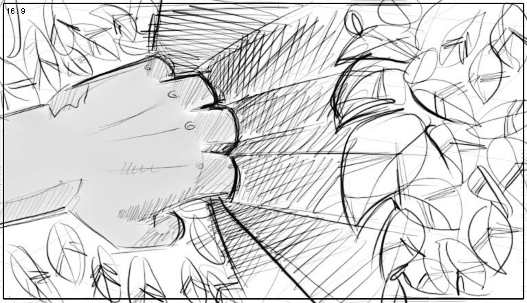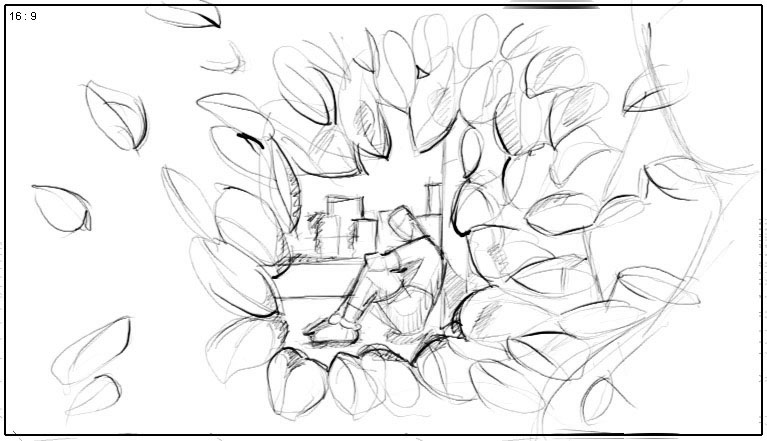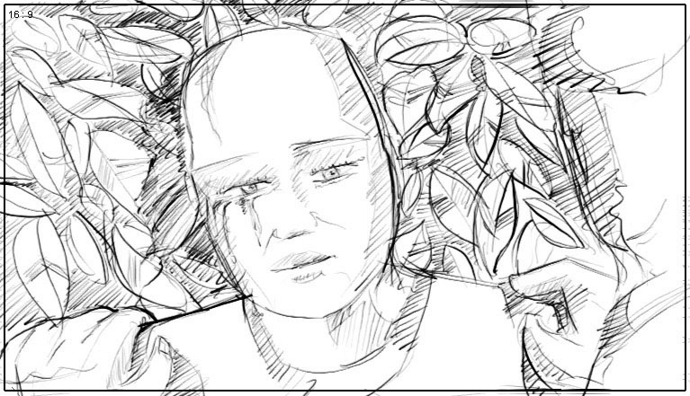 a shrub as if it’s the view of someone watching him, THANDO recognizes something (while looking into the camera) |