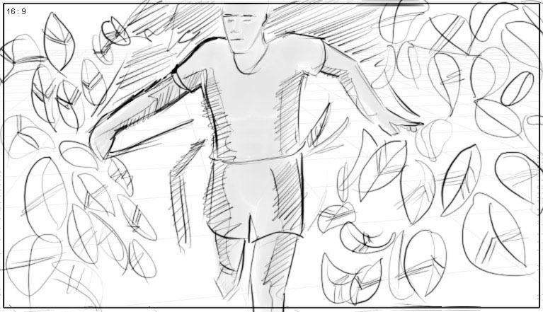 watching position (pushes thru the shrubs)… camera gains on him |