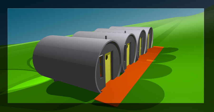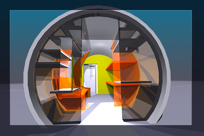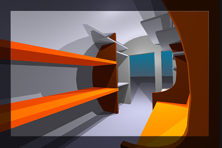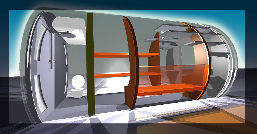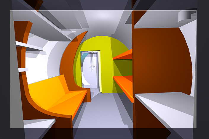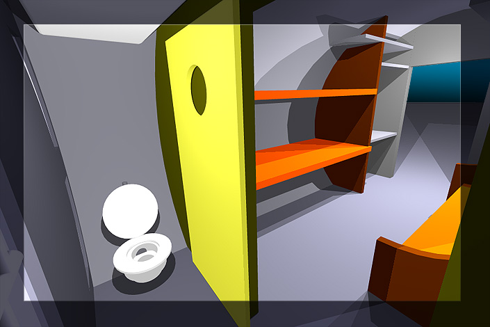 Early layout concept - kitchen in forground, bed/couch in the middle and toilet/shower at the back